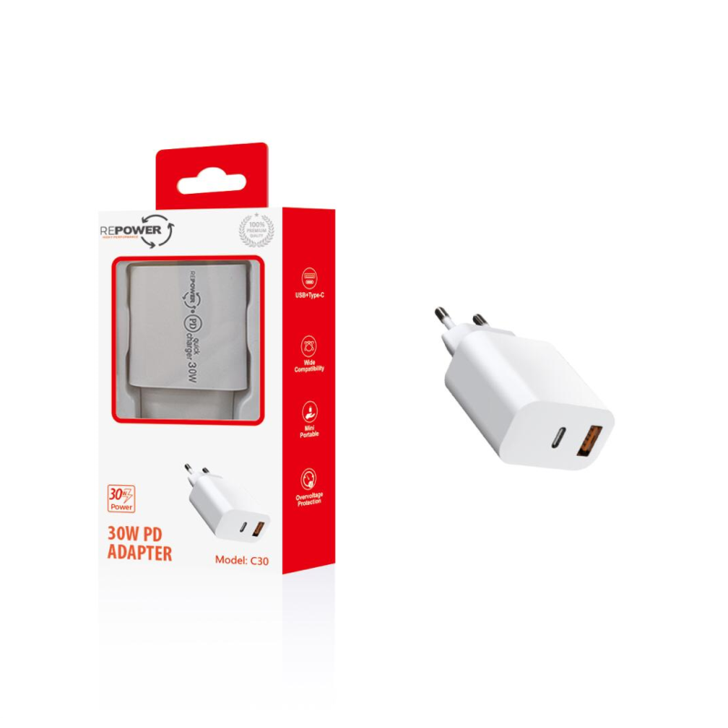 TRAVEL REPOWER 30W CON 2 PORTE, 1 USCITA USB + 1 USCITA USB C BIANCO